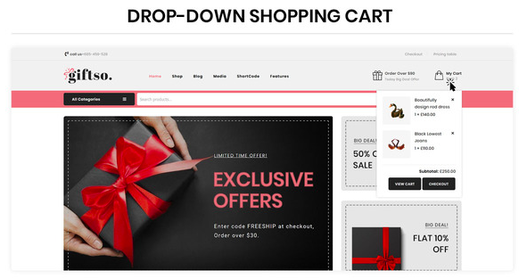 The Drop Down Menu / Drop Down Shopping Cart is a handy interface element. Why do your potential clients need it? Well, with it, they can set up the website in a way that will be easy to navigate, even for first-time visitors. The Drop Down Menu is a tool shown after clicking on it. Giftso has got this necessary feature included in the package.